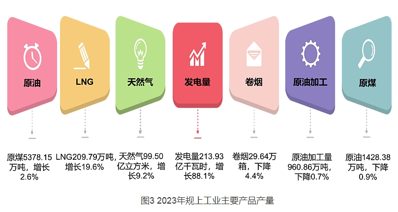 规模以上工业主要产品产量“四升三降”:原煤5378.15万吨,增长2.6%;LNG209.79万吨,增长19.6%;开采天然气99.50亿立方米,增长9.2%;发电量213.93亿千瓦时,增长88.1%。卷烟29.64万箱,下降4.4%;原油加工量960.86万吨,下降0.7%;原油1428.38万吨,下降0.9%。