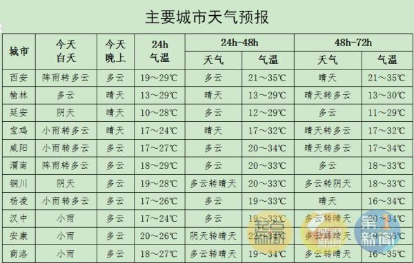 10日:全省多云转阴天,陕北大部、关中西部局地有阵雨或雷阵雨。关中东部部分地方、陕南东部局地有35~37℃的高温天气。