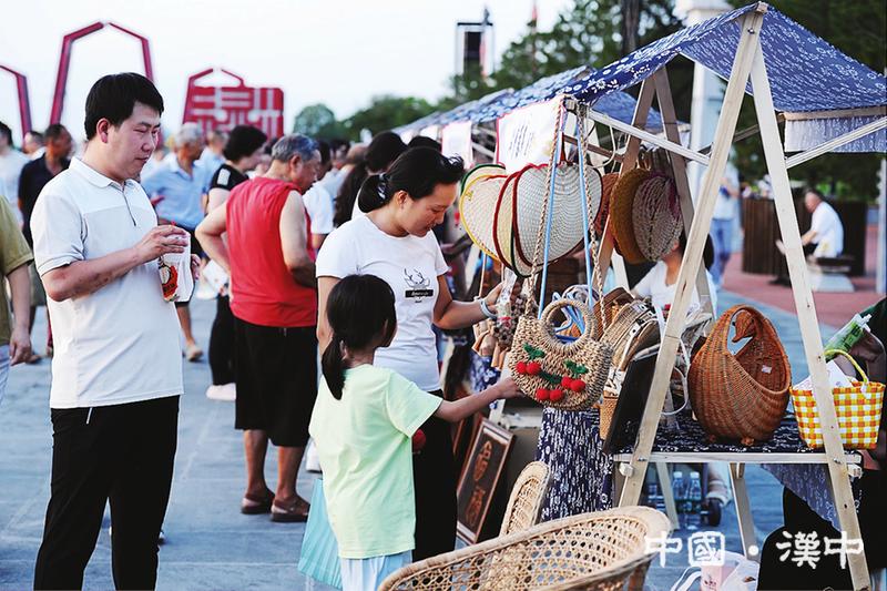 7月11日晚,2025汉中秦岭熊猫音乐嗨唱季在南郑区汉山广场启幕。来看节目的市民在文创集市区咨询购买商品。记者刘俊强摄