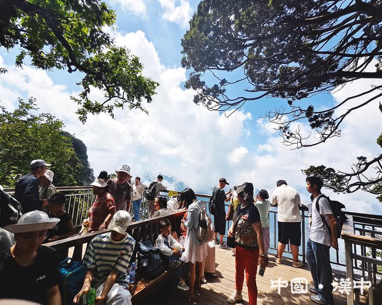 在龙头山景区,游客们登高纳凉,凭栏远眺间,将山间盛景尽收眼底。通讯员张婷婷摄