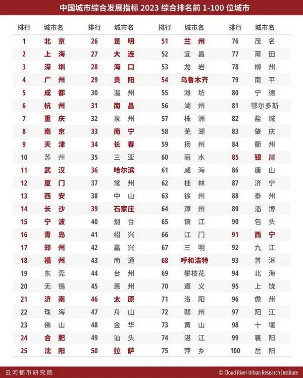 美通社消息:云河都市研究院发布《中国城市综合发展指标2023》。北京连续8年综合排名首位,上海排名第2位,深圳排名第3位。广州、成都、杭州、重庆、南京、天津、苏州,位列综合排名前4-10位。综合排名前11-30位的城市分别是:武汉、厦门、西安、长沙、宁波、青岛、郑州、福州、东莞、无锡、济南、珠海、佛山、合肥、沈阳、昆明、大连、海口、贵阳、温州。