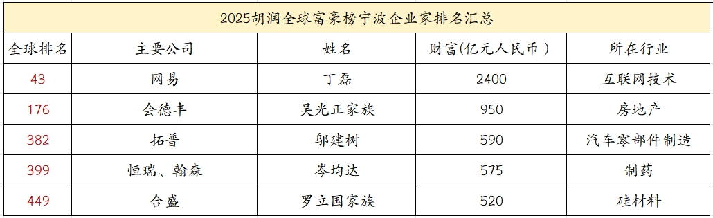 2025胡润全球富豪榜上,宁波共有37人上榜