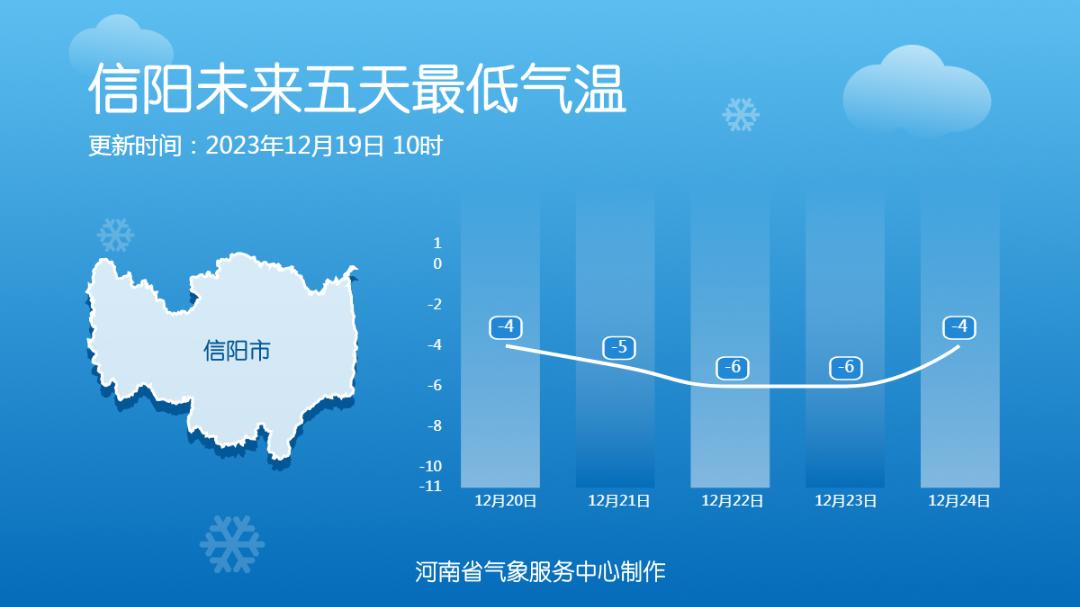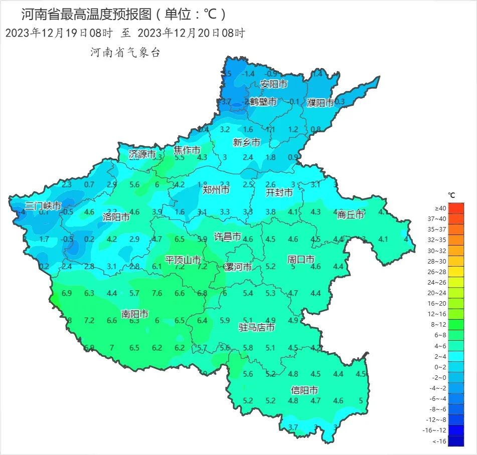 河南省气象台2023年12月19日17时00分继续发布低温蓝色预警:预计19日20时至22日14时安阳、鹤壁、濮阳、新乡、焦作、济源、三门峡、洛阳、郑州北部南部、开封北部、商丘、许昌北部东部、漯河北部、平顶山西部北部、南阳北部最低气温将达到零下15℃到零下10℃。请注意防范。上述地区的相邻县(市、区)也需关注。