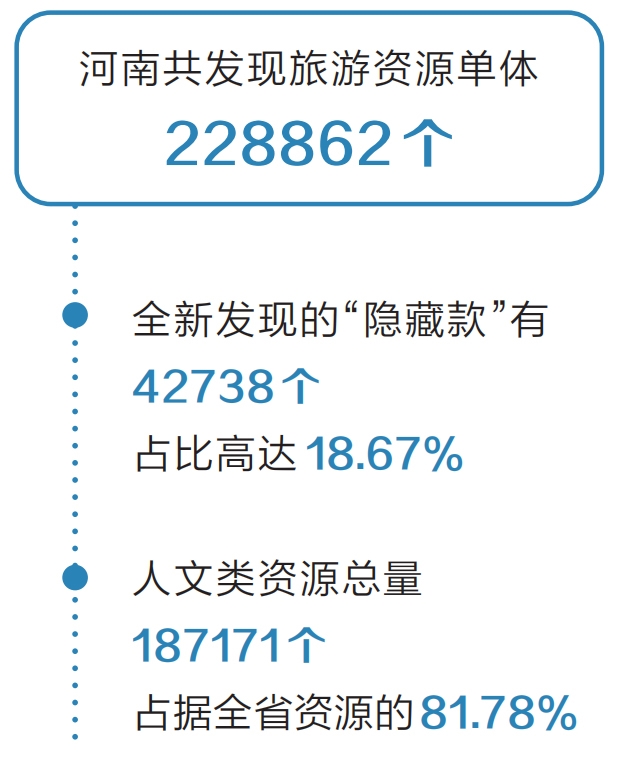 7月22日,记者从河南省旅游资源普查成果展示暨信息管理系统开放运行会议上获悉,河南共发现旅游资源单体228862个,其中42738个是全新发现的“隐藏款”,占比高达18.67%。