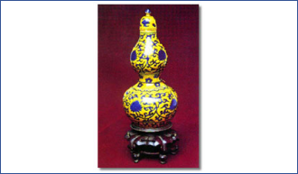 The vase is 22.5cm high with caliber of 3.1cm and bottom diameter of 6.3cm. It was conferred to Dai Temple by Emperor Qianlong of Qing Dynasty in 52nd of his reign. Its cover is hemicycle with a knob like mushroom and adorned with picture of 3 pieces of cyan clouds. There are 3 blossoms of lotus twined together in twigs, 9 blossoms of plum in corset, and 4 blossoms of lotus in below surface and inscribed “made in Jiajing Year” on the bottom. The cyan pigment is typical turn cyan color and the porcelain is exquisite porcelain of Guan ware of Jiajing.