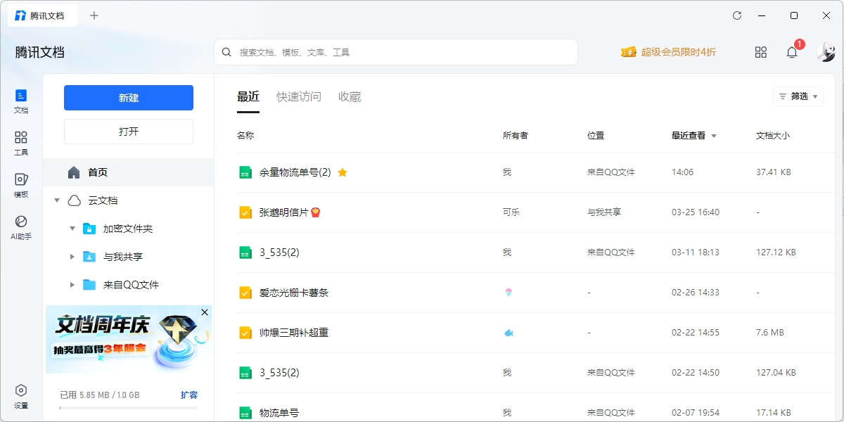 腾讯文档电脑版——腾讯出品的多人在线协作神器!支持Word/Excel/PPT等全格式文档编辑,提供会议纪要、项目管理等海量模板,一键开启高效办公。独创跨QQ/微信平台协作,团队实时同步编辑,历史版本随时追溯。支持网页/手机/电脑多端编辑,无网也能使用,内容实时保存。腾讯技术加密+权限水印双保险,可禁用复制/导出,保障数据安全。更有智能数据收集表、STOCK股票函数等特色工具,搭配OCR识别与语音速记,办公效率倍增!在天极出彩软件园,您可以直接下载腾讯文档的最新电脑版,并查看软件功能介绍、教程相关文章、软件更新日志等信息。天极出彩软件园为您提供安全的下载环境,确保下载过程流畅无忧。