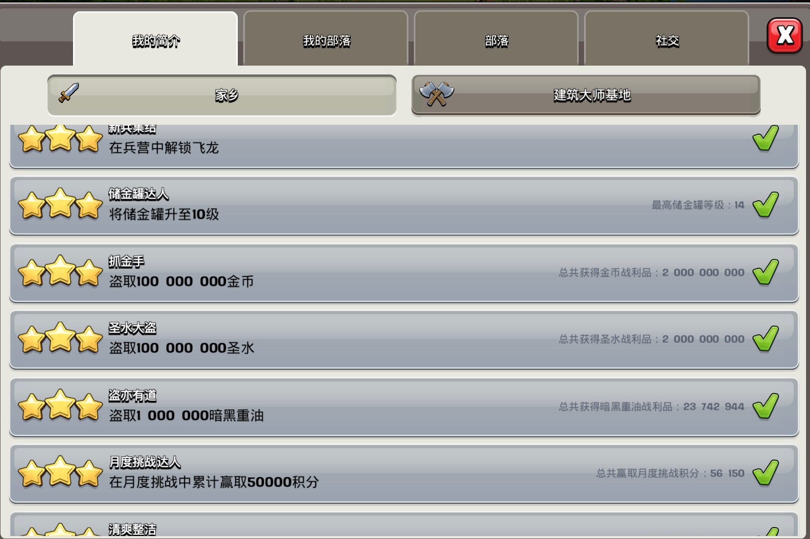 当前版本有 52 个成就,其中“村庄守护者”、“屠龙勇士”和“叛逆小孩”这三个成就只有一个等级,完成之后直接三星,其他成就都有三个等级。所有成就共有 150 个等级。“村庄守护者”成就只对自己可见,其他成就在个人资料中公开显示。