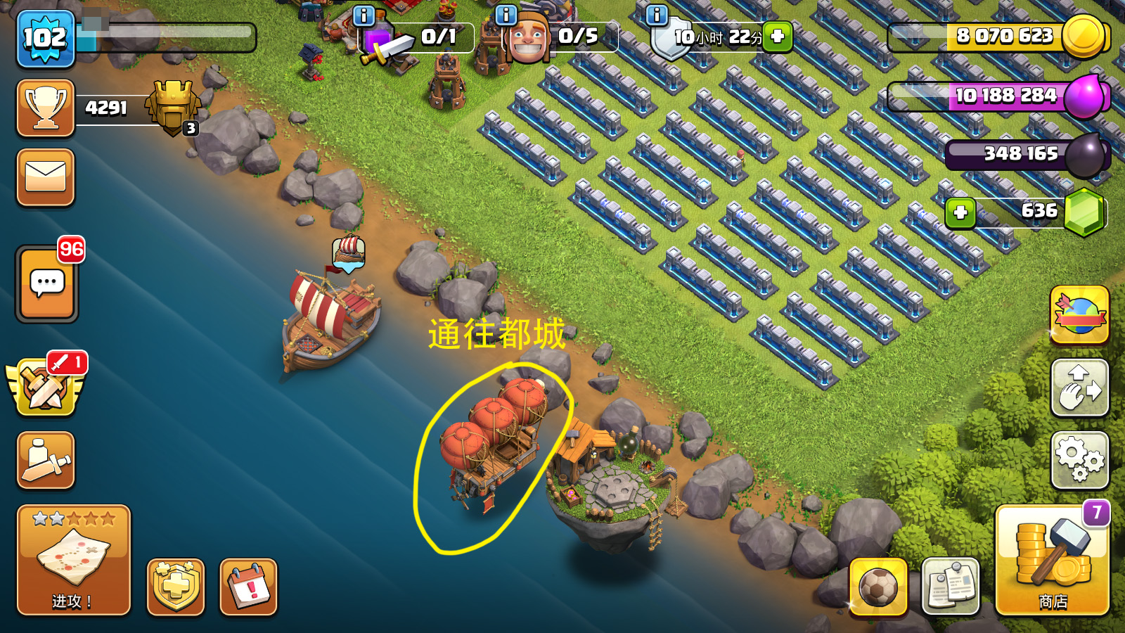 三、部落都城部落都城 是 2022 年 5 月更新后新增的一个模式。当你的大本营升到 6 级后,你会在家乡的左下角看到一个飞空艇,那就是前往都城的媒介。