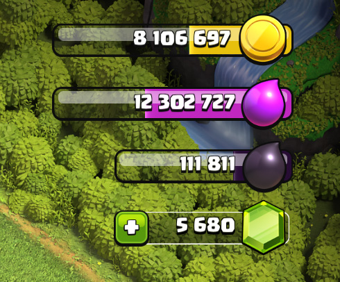 一、家乡的资源你注册游戏后看到的地方就是家乡,这是你游戏生涯的重点,同时也是本文的重点。您的资源数量就显示在游戏主界面右上角,如下图。