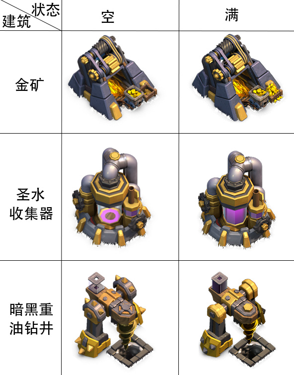 同样,储金罐、圣水瓶这些也可以用肉眼识别空还是满,再比如说地狱塔没弹药时是黑的,这里就不再附图,感兴趣的玩家可以去网站的对应页面查看。