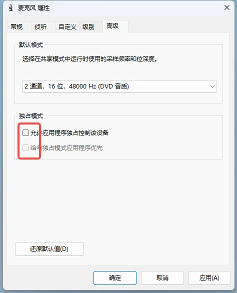 3、Windows下关闭麦克风的独占模式,在此模式下某些应用程序可能会申请独占使用麦克风导致其他应用无法使用麦克风。具体方法为:控制面板→硬件和声音→声音,在录制选项中找到使用的麦克风设备,右键选择属性