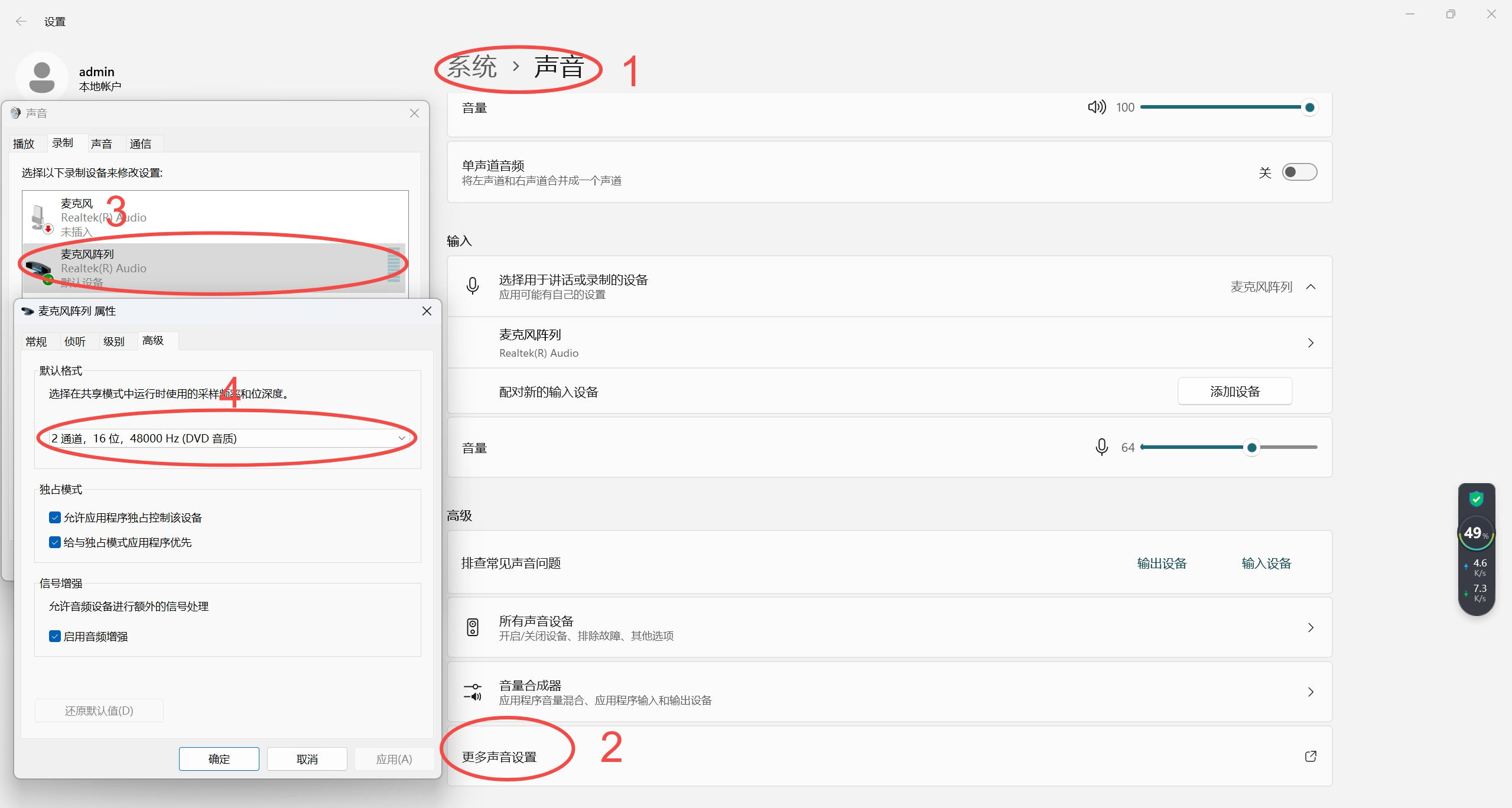 确认你开启了AI智能降噪后,可能是因为你的麦克风设置了比较高的采样率(如果你使用了声卡或者比较好的耳机/麦克风,往往会默认支持较高的采样率),而Oopz目前最高支持48000Hz采样率。可以尝试按照以下步骤调低麦克风采样率,然后重启Oopz客户端,再让你的小伙伴听下你的声音是否恢复正常。