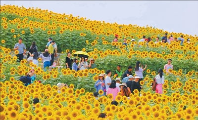 国庆、中秋假期,北京温榆河公园芸上梯田景区的向日葵绚烂绽放,成为市民游客的热门打卡地。