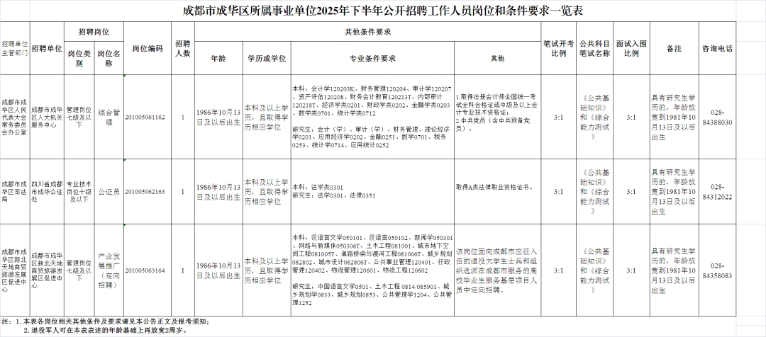 (二)各招聘单位在招聘过程中对其公告内容如有调整、补充说明等事项,请应聘考生及时关注并登录四川省人力资源和社会保障厅官网、成都人事考试网查阅补充公告。应聘考生在报名信息填报时要认真详细填写联系方式,确保联系方式准确、畅通,因报考者不主动、不按要求登录相关网站查阅相关信息,未能按公告要求参加报名、资格审查、考试、体检、考察、聘用或因招聘单位无法与报考者取得联系所造成的后果,责任自负。