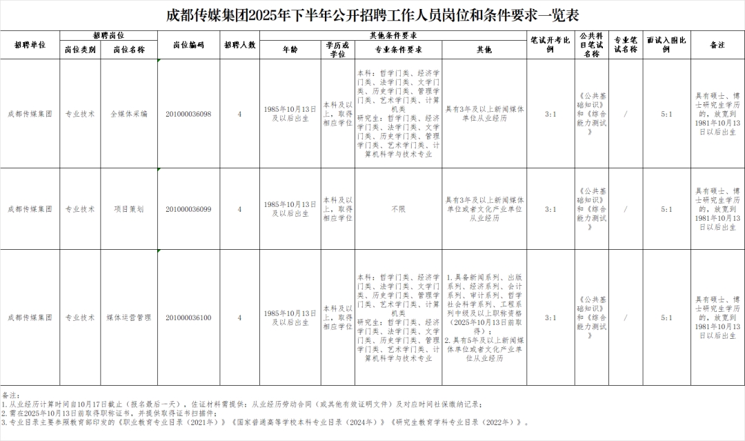 成都市广播电视台面向社会公开招聘工作人员20名。