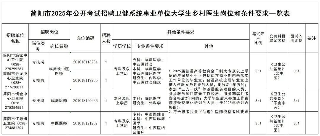 简阳市卫生健康局所属4家医疗卫生单位拟面向社会公开招聘大学生乡村医生4名。