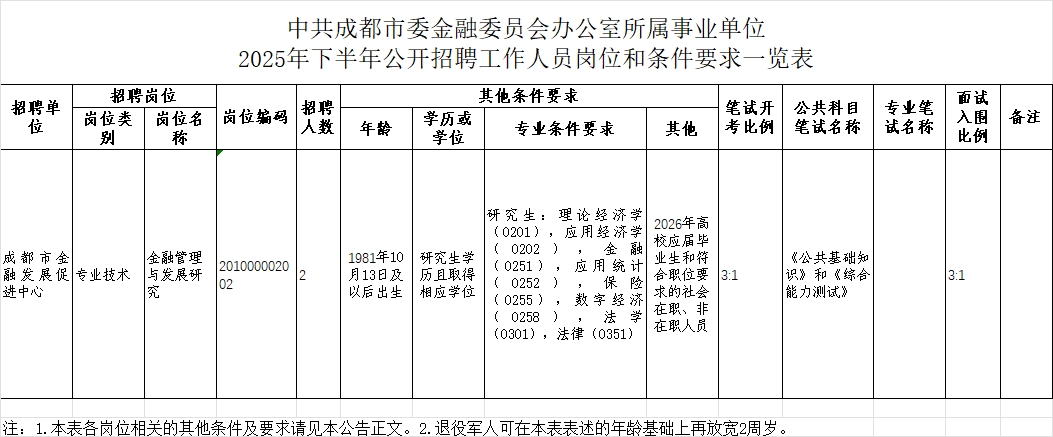 中共成都市委金融委员会办公室面向社会公开招聘工作人员2名。