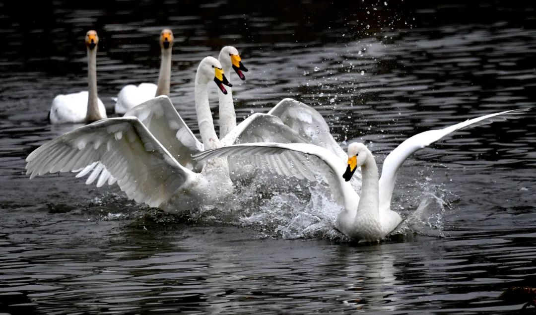 大天鹅在三门峡黄河湿地嬉戏。新华社记者 朱祥 摄