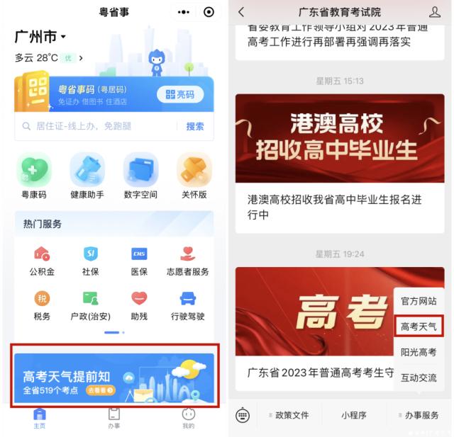 广东省气象局与省教育考试院、“粤省事”携手,推出精细到全省519个高考考场的气象预报预警服务,考生、家长可通过“缤纷微天气”小程序、“广东省教育考试院”微信公众号、“粤省事”小程序、“停课铃”APP,获取考场位置2小时分钟级降雨预报、7天天气预报、预警等气象信息。