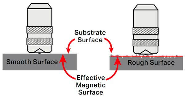 所有的涂层测厚仪都在一定程度上受到基材粗糙度的影响,如下图所示。一般认为,涂层厚度应该从粗糙表面的最高 "山峰 "测量,从而确保它们被保护层覆盖。然而,涂层测厚仪将从 "有效磁力面 "测量涂层厚度,该磁力面位于剖面的最高峰和最深谷之间。