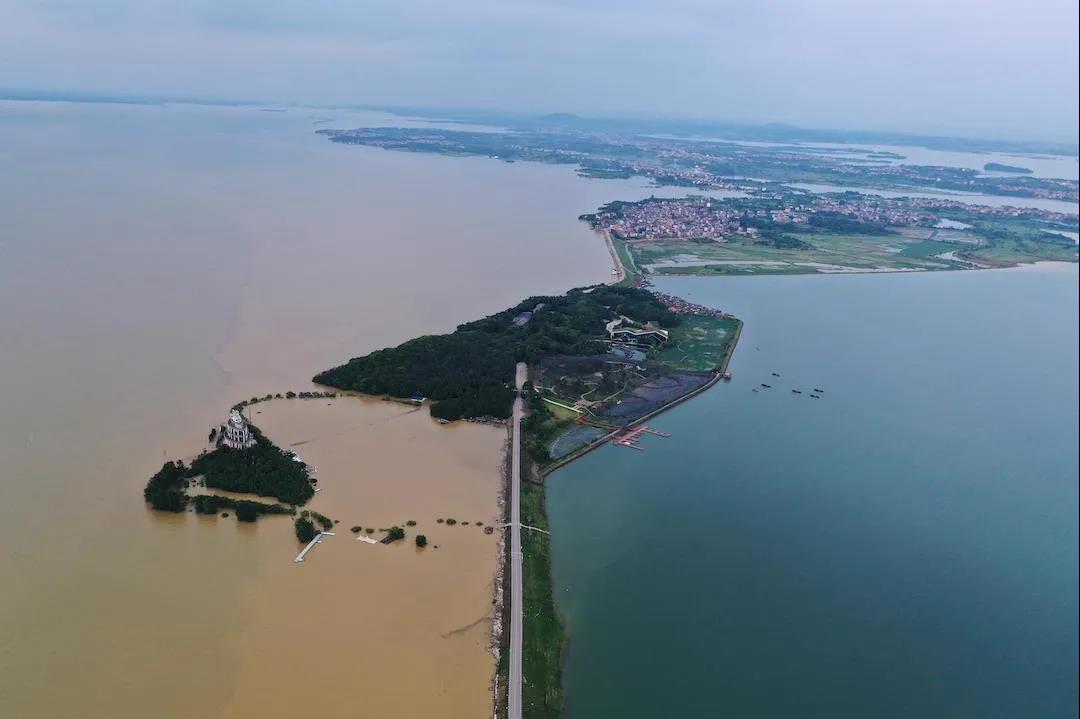 △江西鄱阳湖东岸,一侧为清澈的鄱阳湖内湖珠湖,一侧为因暴雨变浑浊的鄱阳湖外湖。