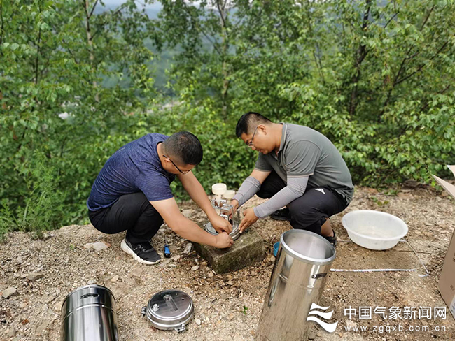 2022年7月16日,商洛市洛南县气象局业务人员维修石门镇黄龙铺雨量站。姬龙毅摄影