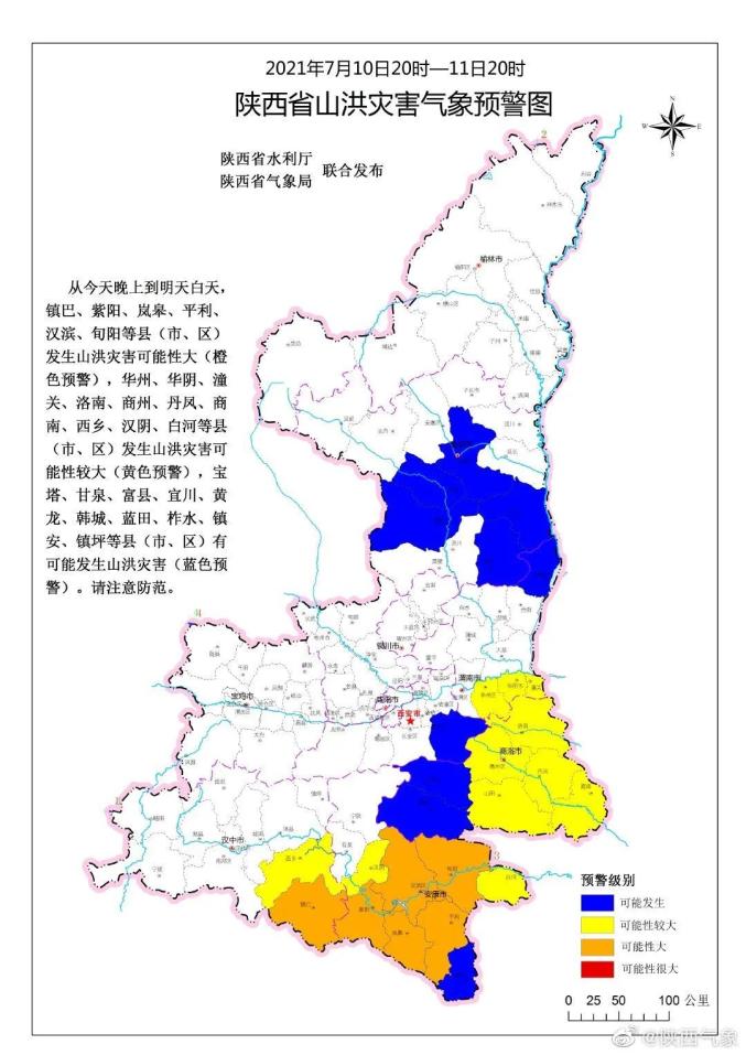 预计2021年7月10日20时至2021年7月11日20时,镇巴、紫阳、岚皋、平利、汉滨、旬阳等县(市、区)发生山洪灾害可能性大(橙色预警),华州、华阴、潼关、洛南、商州、丹凤、商南、西乡、汉阴、白河等县(市、区)发生山洪灾害可能性较大(黄色预警),宝塔、甘泉、富县、宜川、黄龙、韩城、蓝田、柞水、镇安、镇坪等县(市、区)有可能发生山洪灾害(蓝色预警)。请注意防范。