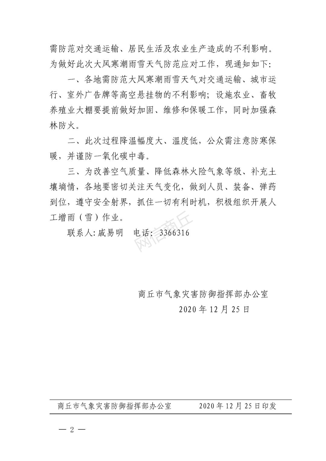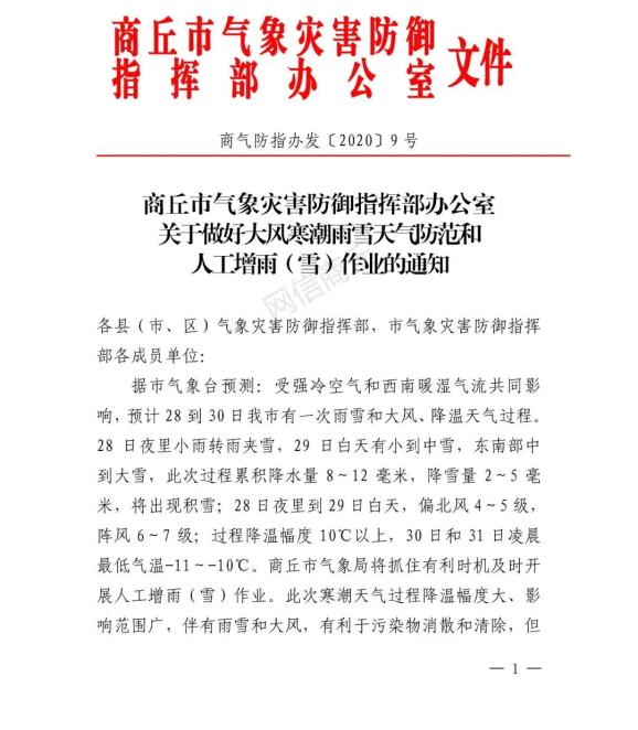 商丘市气象局将抓住有利时机及时开展人工增雨(雪)作业。此次寒潮天气过程降温幅度大、影响范围广,伴有雨雪和大风,有利于污染物消散和清除,但需防范对交通运输、居民生活及农业生产造成的不利影响。