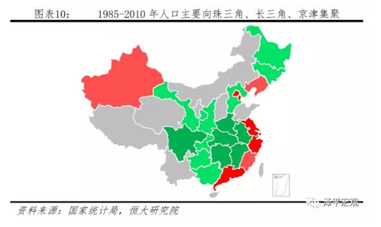 3、2010年以来,随着沿海地区产业转型升级、中西部地区产业承接以及老一代农民工老化,部分人口逐渐回流中西部,东北地区人口开始负增长。在这一趋势下,我们看到,在东部地区就业的农民工规模在2012年达峰值,省外就业的外出农民工规模、人户分离人口规模、流动人口规模均在2014年达峰值然后下降,2015年人口抽样调查表明2010-2015年的跨省迁移人口已较2005-2010年下滑。一方面,珠三角、长三角、京津2017年的经济份额为36.8%、较2010年下滑0.9个百分点;2017年人口占比为22.3%,仅提高0.3个百分点,表明人口仍在集聚但已放缓。其中,长三角人口占比下滑0.1个百分点。另一方面,中西部农民工输出大省常住人口增长明显加快,四川、湖北、贵州等之前人口一度负增长的地区逐渐重回正增长。而东北地区衰落趋势未得扭转,经济份额降至6.7%、较1978年下滑6.5个百分点,黑龙江、辽宁、吉林人口先后从2014年开始陷入负增长。