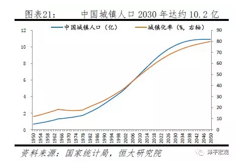 根据联合国预测,到2030年中国城市化率将达约70%,对应城镇人口为10.2亿,比2017年增加约2亿;到2047年城镇人口达峰值时将增加约2.76亿。国际经验表明,城市化发展近似一条稍被拉平的“S”型曲线,大致分为三个阶段:缓慢发展期(30%以前)、快速发展期(30%-70%)、稳定发展期(70%之后)。其中,第二阶段快速发展期又大致以50%为临界点分为两个阶段,之前为加速发展期,之后为减速发展期。中国城市化已进入快速发展期的减速发展阶段。根据《国家人口发展规划(2016-2030)》预测,中国人口将在2030年前后达到峰值,此后持续下降;届时即2030年中国城市化率将达70%。而根据联合国《世界城市化展望2018》预测,中国人口将在2029年左右达峰值,中国城市化率将在2030年达70.6%、即城镇人口达10.2亿,但2047年城镇人口将达10.9亿的峰值、对应城市化率79%,2050年城市化率将达80%。因此,到2030年中国城镇人口将比2017年增加约2亿,到2047年城镇人口达峰值时将比2017年增加约2.76亿。