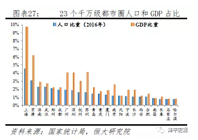 未来2亿新增城镇人口去向何方?1)根据联合国预测,到2030年中国城市化率将达约70%,对应城镇人口为10.2亿,比2017年增加约2亿;到2047年城镇人口达峰值时将增加约2.76亿。2)简单按当前趋势推算,未来2亿新增城镇人口有约50%、即1亿人来自乡城迁移,其他则将是自然增长和行政区划变动贡献。3)19大城市群以1/4土地集聚74%人口,创造90%GDP,其中城镇人口占比77%。到2030年2亿新增城镇人口的约80%将分布在19个城市群,约60%将分布在长三角、珠三角、京津冀、长江中游、成渝、中原、山东半岛等七大城市群。中国未来有望形成长三角、京津冀、长江中游、山东半岛、成渝等5个人口亿级城市群,10个以上1000万级城市,12个左右2000万级大都市圈。