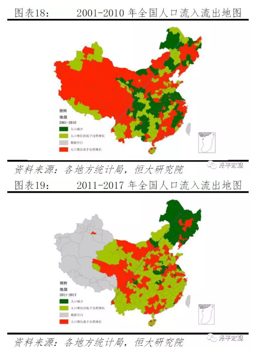 从地域分布看(红色表示人口净流入,深绿色表示人口净流出中的人口减少,浅绿色表示人口净流出中的人口正增长,灰色表示数据空白),在2001-2010年,扣除西北地区、西藏小量人口净流入外,人口净流入地区主要在东南沿海、华北、辽宁等地,而人口净流出地区主要在华中、华南(不含广东)和西南、黑龙江、吉林等地。到2011-2017年,扣除数据大幅缺失的新疆、西藏外,人口净流出地区主要集中东北地区、中西部的大部分地区以及东南沿海的非核心城市等,人口净流入地区明显变少、且趋向破碎化,主要在全国主要大城市及周边地区,包括广深佛珠肇、京津、沪宁杭苏常、合肥、南昌、石家庄、郑州-洛阳、武汉、长沙-岳阳、济南、青岛、西咸、成渝、昆明、贵阳、南宁、呼包鄂,以及广西桂柳及桂东南地区、粤西、苏北、晋中南、川西川北等。