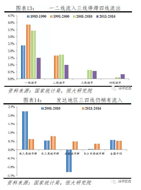 进一步细分,与一般三四线城市明显不同,发达城市群的三四线城市人口仍稍有流入。2001-2010年、2011-2016年,珠三角城市群的三四线城市年均增速分别为2.24%、0.61%,长三角城市群三四线城市群分别为0.52%、0.78%。与两个时期全国人口平均增速0.57%、0.51%相比,珠三角城市群三四线城市在2001-2010年人口明显流入、2011-2016年略有流入,长三角城市群三四线城市在2011-2016年人口稍有流入。而在中西部城市群,三四线城市人口多为净迁出。比如,成渝城市群扣除成都、重庆主城九区后,两个时期人口年均增速分别为-1.3%、0.48%;而长江中游城市群扣除武汉、长沙、南昌后,两个时期人口年均增速分别为0.03%、0.35%。