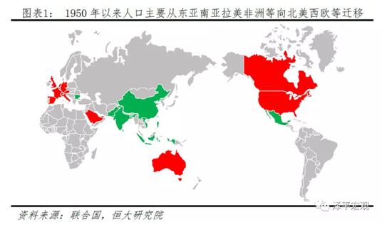 全球人口迁移呈现两大特点:一是在跨国层面,人口从中等、低收入国家向高收入国家迁移。根据联合国《世界人口展望(2017年修订版)》统计,1960-2015年,高收入经济体人口净流入规模累计达1.2亿,其中来自中高收入、中低收入、低收入经济体的比例分别为23.9%、59.5%、16.6%。中高收入经济体人口生活水平接近高收入经济体,迁移动力不强;低收入经济体人口虽然迁移动力强,但难以承担迁移成本;而中低收入经济体人口迁移动力强,且能够承担迁移成本。从国别看,主要是人口从东亚(中国、菲律宾、印尼、越南等)、南亚(孟加拉国、印度、巴基斯坦)、拉美(墨西哥)、非洲、中东欧向北美、西欧、中东石油富国(阿联酋、沙特阿拉伯)、澳大利亚、俄罗斯等迁移。其中,1950-2015年美国净迁入人口超过4800万、沙特阿拉伯和阿联酋净迁入合计接近1600万,德法英西意等西欧五国净迁入合计超过1100万,加拿大、俄罗斯净迁入约900万,澳大利亚净迁入近700万。日本移民政策长期较为保守,净迁入人口较少。