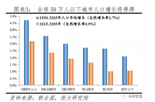 二是在城乡层面,随着全球城市化进程进入中后期,不同规模城市人口增长将从过去的齐增变为分化,人口从乡村和中小城市向一二线大都市圈迁移,而中小城市人口增长面临停滞、甚至净迁出。1950-2015年,全球城市化率从29.6%增至53.9%,该时期所有规模城市的人口占比均有明显上升,所有规模城市人口年均增速均明显超过1.7%的自然增长水平。其中,1000万人以上城市人口占全球总人口比重从0.9%增至6.3%,30万人以下小城市人口占比从17.8%升至22.9%,分别上升5.3、5.2个百分点。根据联合国预测,到2035年全球城市化率将达62.5%,大城市和大都市圈人口继续快速积聚,但50万人以下城市人口年均增速将降至1%、略高于0.9%的自然增长水平。