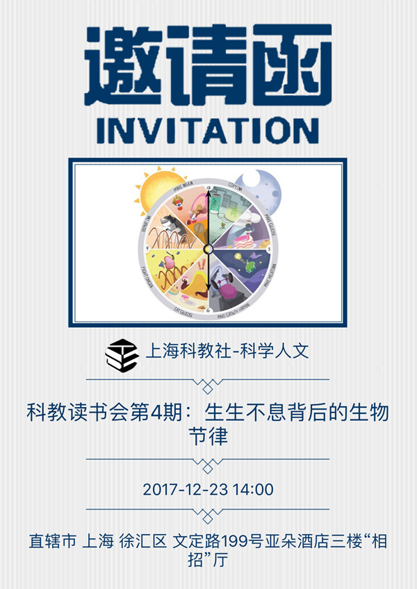 2017年10月,诺贝尔生理学医学奖授予三名美国科学家杰弗里· 霍尔(Jeffrey C. Hall)、迈克尔·罗斯巴什(Michael Rosbash)和迈克尔·杨(Michael W. Young),以表彰他们在生物节律研究方面所作出的开创性贡献。那么,究竟我们为何“日出而作,日入而息”?为何会有鸟儿迁徙,动物冬眠?出生的时间和季节真的影响了我们的健康和生活际遇吗?今年诺贝尔生理学医学奖所说的“生物钟”是怎么一回事?科教读书会邀请中国科学院研究员严军,带你探索奇妙的生物节律世界。