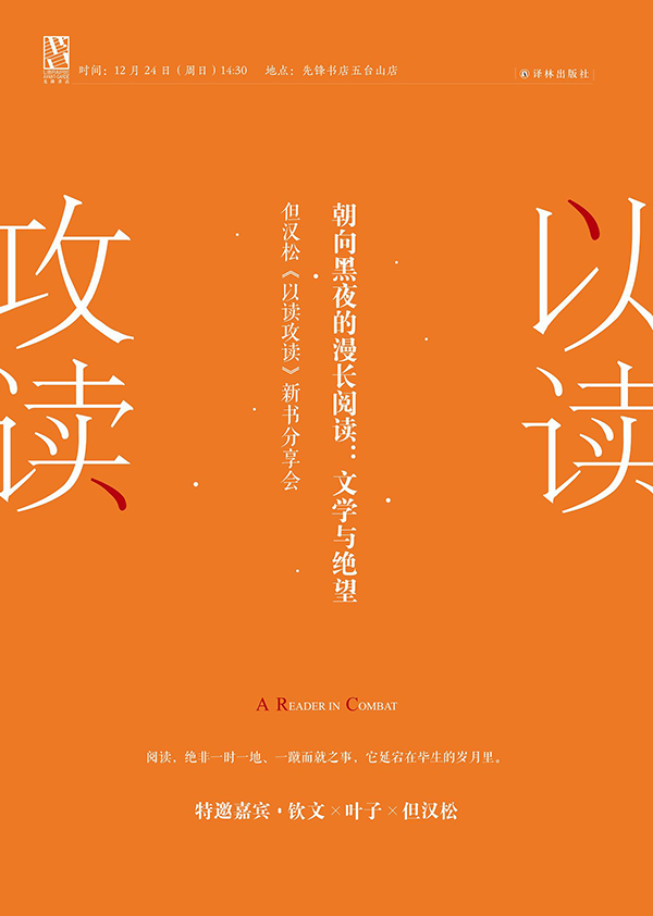 阅读是作者与读者的狭路相逢,是生命内部体验的沟通,需要我们亲力亲为。这本《以读攻读》,以及这次分享会,并不是终极攻略或入门指南,而是一种分享与邀约。12月24日下午,欢迎光临南京先锋书店,南京大学德语系钦文老师、文学院叶子老师两位嘉宾,将和但汉松聊一聊关于阅读这件小事。
