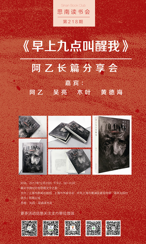 五年前,阿乙便开始写作长篇《早上九点叫醒我》,原来只想写成短篇,空间容纳不下他的叙事渴望,改中篇,还是不够,遂发展为长篇,但文字的密度和质感,不输短篇小说字斟句酌的产出。修改数十稿后,阿乙的第一部长篇小说《早上九点叫醒我》终于面世。阿乙为何会选择这样一种用力到自我损害的方式写作,甚至写到生病?他的这部长篇和过去的作品相比,有哪些自我颠覆与突破?阿乙对自己的写作生涯和未来的写作方向,又有怎样的反顾与筹划?12月23日下午,欢迎光临思南文学之家,沪上著名作家与批评家吴亮、木叶和黄德海三位嘉宾,将和阿乙共同聊一聊这部《早上九点叫醒我》。