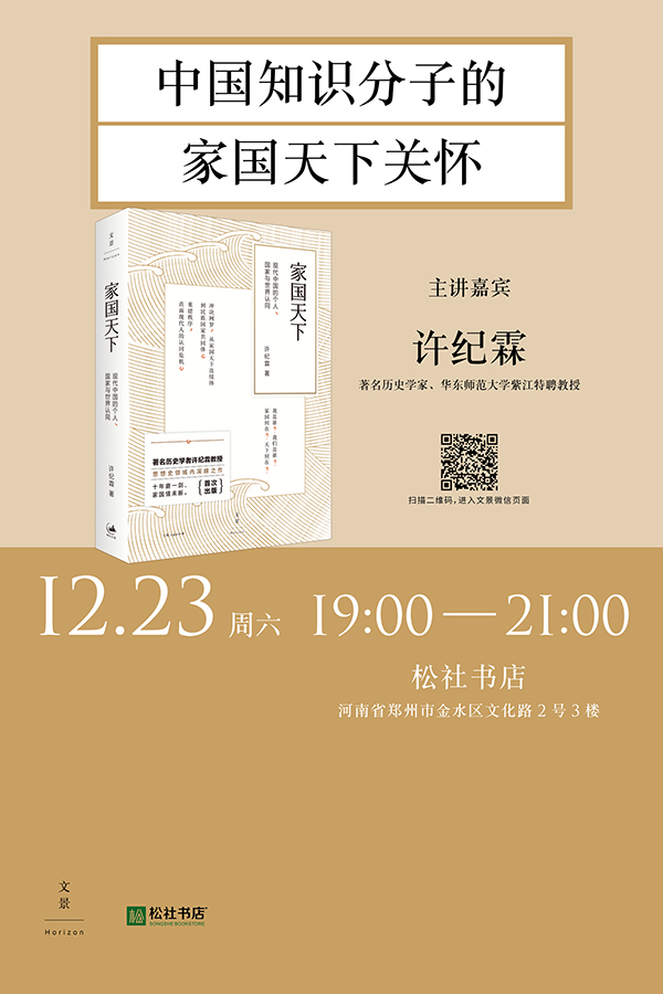 许纪霖教授意在思想史中探寻中国近现代国家认同所受到的冲击和转变。他从传统的“天下观念”遭受现代性冲击入手,讨论了儒家、晚清立宪派与革命派、晚清的地方认同和个人认同、五四的“世界主义”、文明与富强之间的竞争、民族主义等中国近现代思想革命中的尝试。12月23日晚,许纪霖教授将做客郑州松社书店,和到场的各位一起深谈何谓“家国天下”,何谓知识分子,何谓中国知识分子的家国天下关怀。