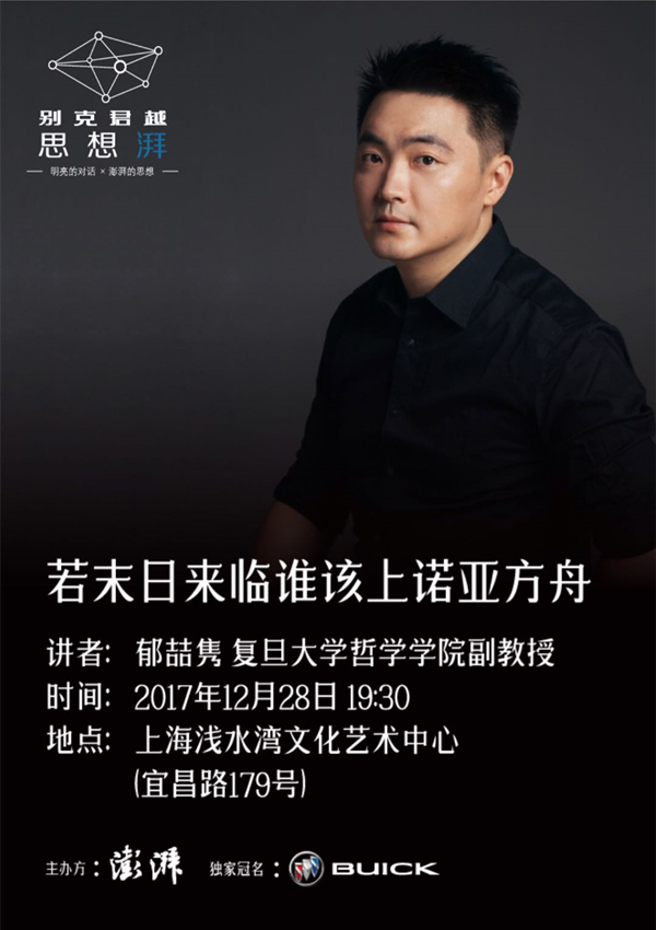 郁喆隽,复旦大学哲学学院副教授,其讲课生动风趣,充满智慧,被称为复旦大学“哲学小王子”。他的哲学命题与思想实验,拥有超高人气。哲学在绝大多数西方发达国家是一门基础教育课,它挑战你的观点,锐化你的思维。善于剖析人性深层的他,此次将把大众置身于人类毁灭的视野,从哲学角度和你一起探讨该谁登上诺亚方舟。