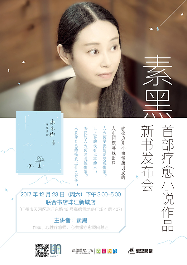 素黑,被誉为华语世界最具影响力情感治疗作家。她浪荡过很多地方,出走是她的灵修方式;喜爱猫、尺八和孤独更甚于写作和说话;爱黑、爱素、爱自然,爱树爱山爱大海,尊重生命分享爱,活着是为呈现比爱情更大的爱。近年,她开发结合声音、形体和艺术的治疗,创立观音定心及黑洞疗法,应邀在国内外公开演说,开办声疗工作坊及专业情绪自疗课程等。本次活动,她将携新作《麻木树疗伤茶馆》为读者带来一场温馨的心理治疗。