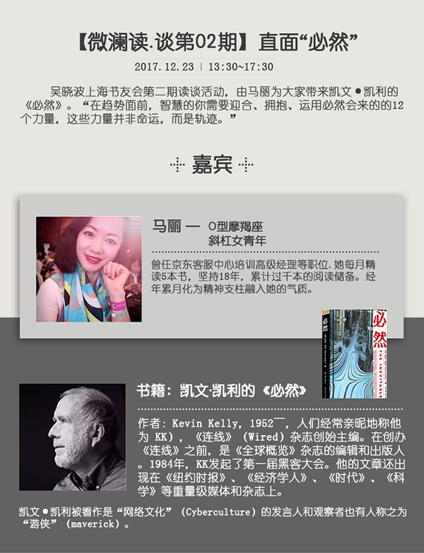 在《必然》中,作者凯文·凯利基于过往从业经历和对未来趋势的敏锐观察对12个关键词(形成、知化、流动、屏读、使用、共享、过滤、重混、互动、追踪、提问、开始)进行了深入浅出的论断,并结合现实生活中种种生动的案例,给我们指明了科技新物种不断变迁的12条道路。“吴晓波上海书友会”第二期读谈活动,由马丽为大家带来凯文·凯利的《必然》。
