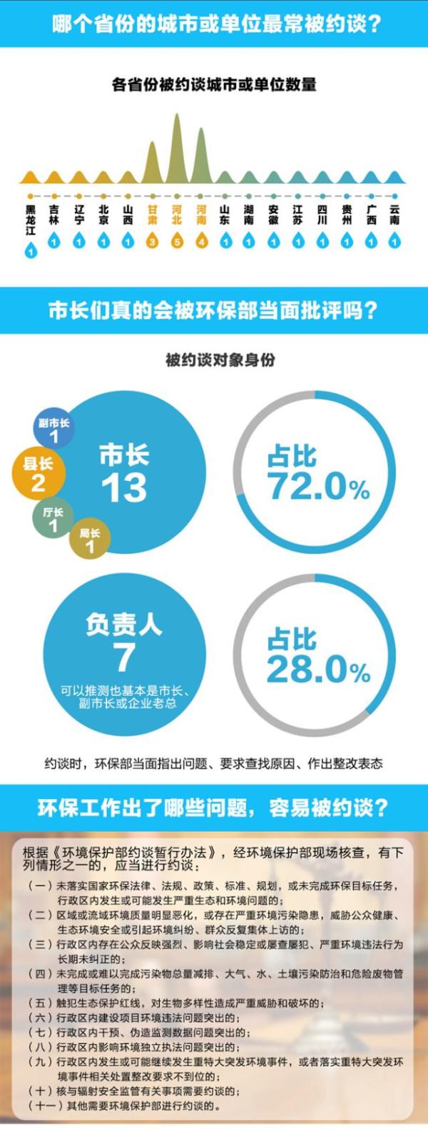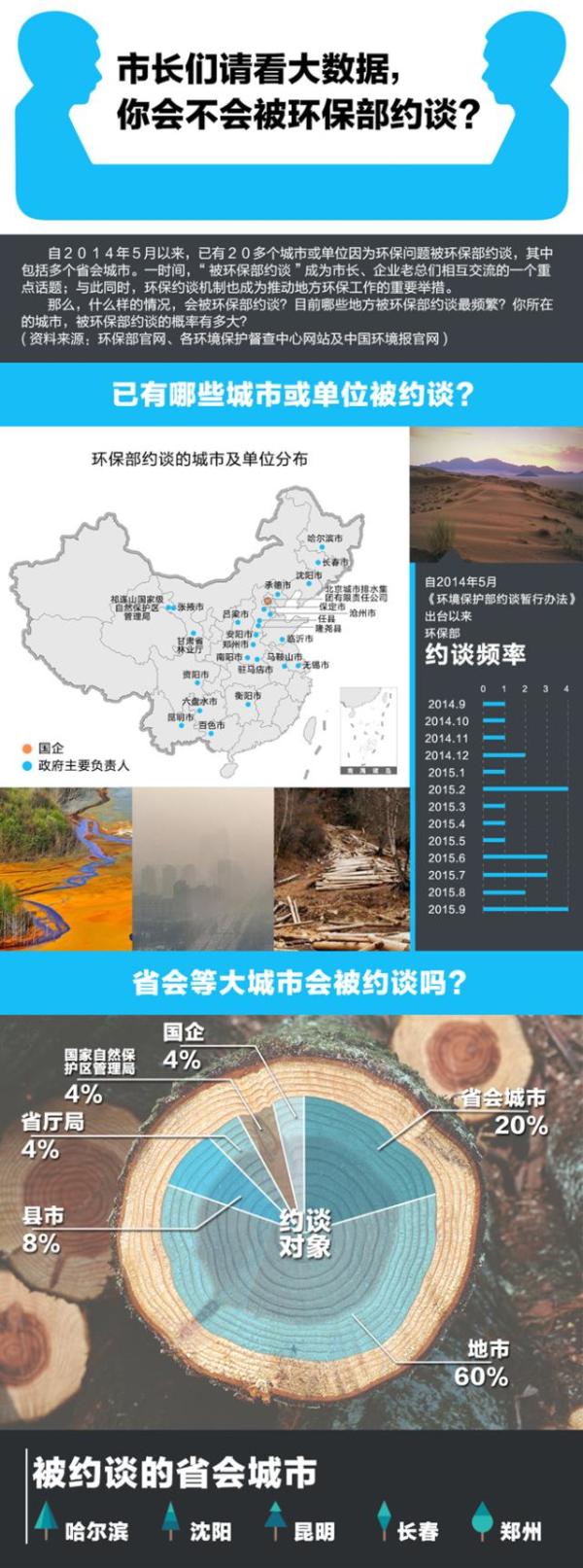 那么,什么样的情况,会被环保部约谈?目前哪些地方被环保部约谈最频繁?你所在的城市或单位,被环保部约谈的概率有多大?新华社“中国网事”记者对已经被环保部约谈的城市和单位进行了大数据梳理,或许可以给市长、企业老总们一些借鉴。