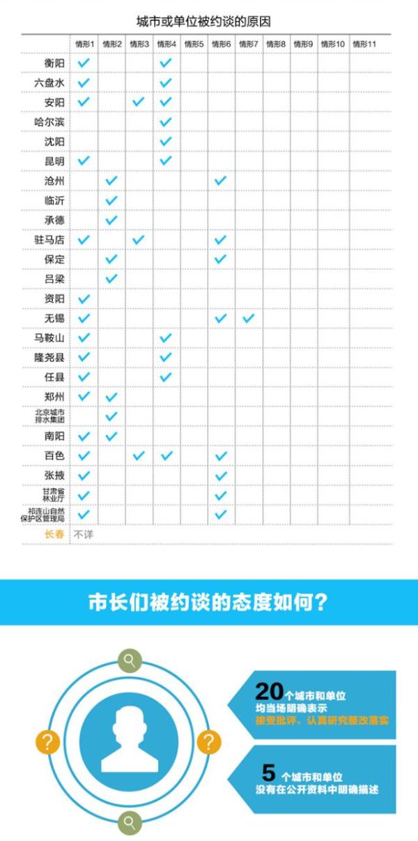 根据统计,目前25个城市或单位中,除了5个城市或单位因为没有在公开资料中明确描述,尚不清楚被约谈者的态度和当地的整改措施,其他20个城市和单位均当场明确表示接受批评、认真研究整改落实。