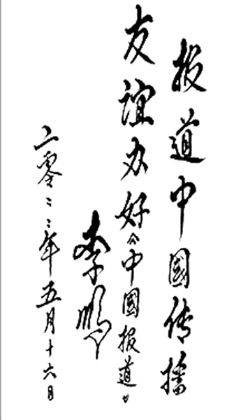 2000年5月,时任全国人大常委会委员长李鹏为《中国报道》创刊50周年题词