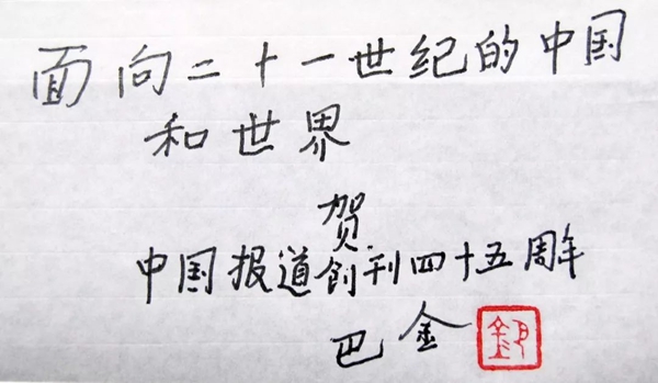 1995年,著名作家、第十届全国政协副主席巴金为《中国报道》创刊45周年题词