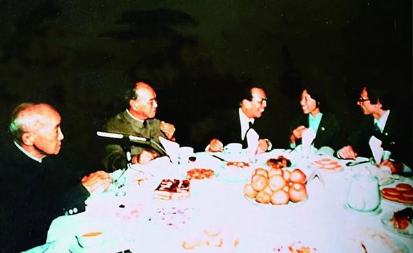 1985年5月,《中国报道》杂志创刊35周年,党和国家领导人(从左至右)胡愈之、姚依林、黄华出席纪念大会