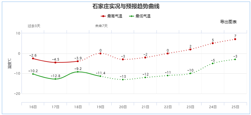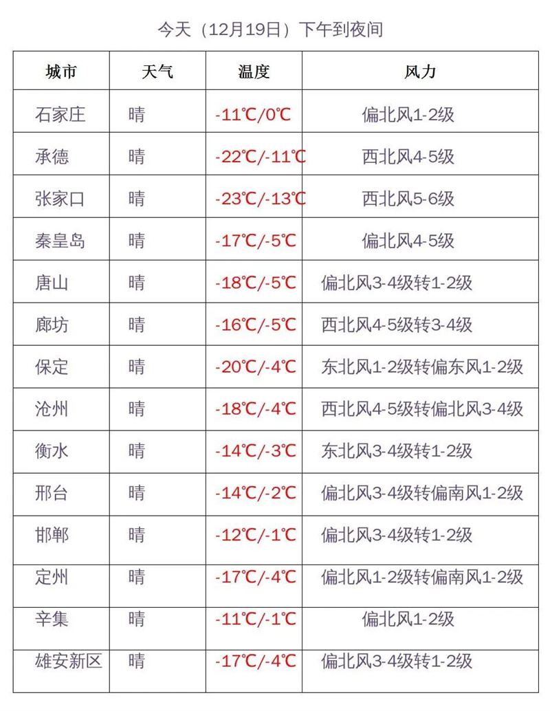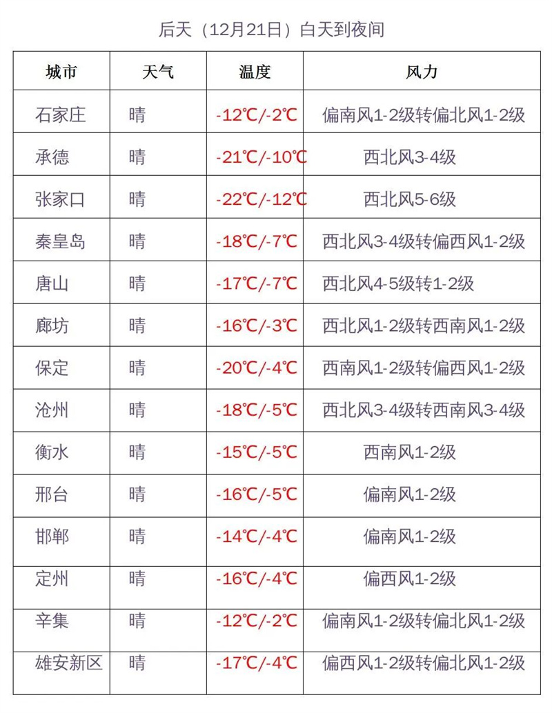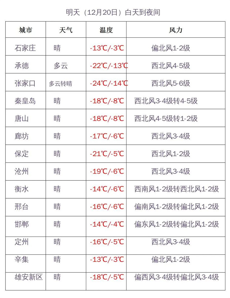 明天早晨,最低气温,张家口、承德、秦皇岛北部、保定西北部低至-32~-22℃,其他地区低至-21~-12℃。