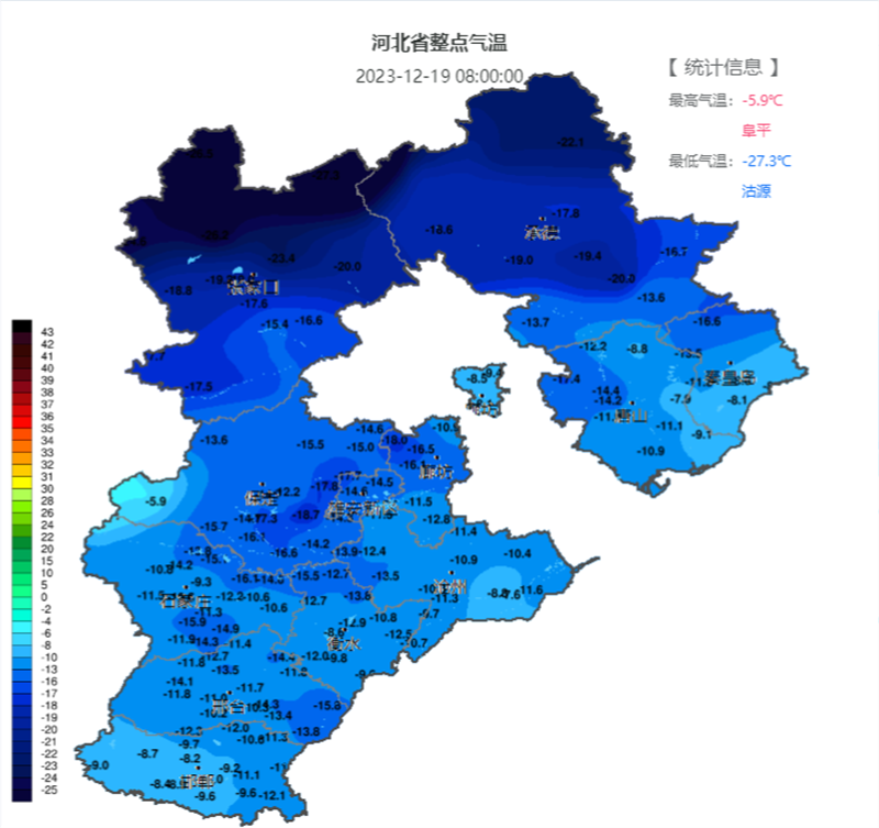今天一早河北全省都沉寂在“出门分分钟冻透”的寒冷里,8点气温无一例外都跌落到了-5℃以下,越往北越冷,沽源、康保、张北在-25℃以下。