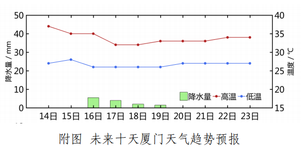 14—15 日天气多云到晴,16—19日受热带低值系统外围影响,多雷阵雨 ,降水时局地伴有短时强降水、短时大风等强对流天气。